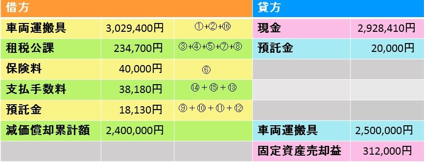 車両運搬具 2,805,000円(①+②+⑯) 現金 2,928,410円