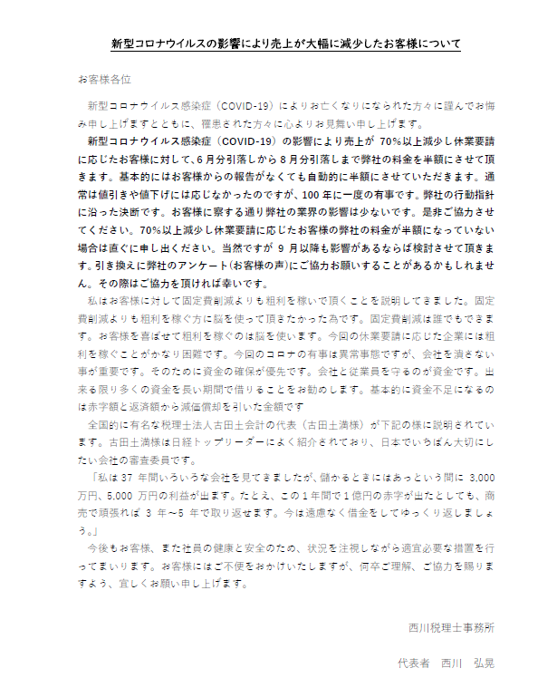 私は規模ではなく、生産性に͡こだわって来ました。なので借入もほぼありません。積極的な減額をしますが、ご心配なく。給料は下げません。賞与の評価にも影響させません。ただし、賞与は経営者から頂くものです。経営計画書に書いてあることを積極的に実践してください。
